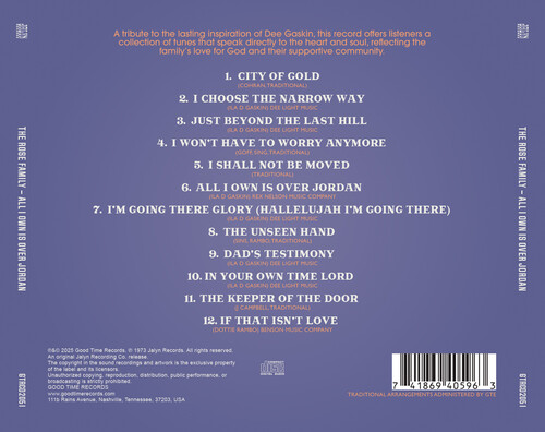 Jalyn Records is back! The Dayton, Ohio label from the creative mind of bluegrass legend Jack Lynch originally ran from the early '60s through the late '70s. Working out of his apartment on Brown Street, Lynch turned out a steady run of hard-driving bluegrass, country, and gospel sides cut by local pickers and big names alike, including Ralph Stanley and Don Reno. Decades on, these records are now lovingly remastered for modern ears and available on CD for the first time. On this album, The Rose Family bring a fresh, heartfelt energy to this collection of traditional and original songs - showcasing their passion for sharing God's message and their sincere commitment to their faith and their music. Rooted in tradition, this album honors the timeless spirit of gospel with intimate harmonies and sparse instrumentation, inviting listeners into a world where faith, family, and the land are woven together in every note.