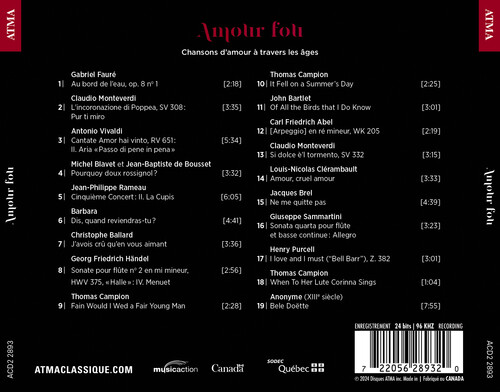 Myriam Leblanc/Ensemble Mirabilia - "Amour fou" / With the album, Amour fou, soprano Myriam Leblanc and Ensemble Mirabilia take us on a journey of love via arias and songs spanning more than 800 years. From Fauré's poetic, "Au bord de l'eau," to Jacques Brel's heartrending, "Ne me quitte pas," and Barbara's, "Dis quand reviendras-tu?" Leblanc has gathered a bouquet of music depicting the most human of all sentiments. Amour fou also includes an aria from Vivaldi's cantata Amor hai vento, several old English songs by Thomas Campion and more.