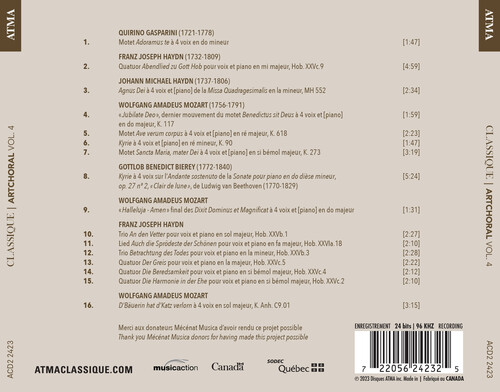 Ensemble ArtChoral/Matthias Maute/Ilya Poletaev - "Art Choral, Vol. 4" - ATMA Classique, Ensemble ArtChoral and Mécénat Musica are proud to present Art Choral, Vol. 4: Classique with Ensemble ArtChoral under the direction of Matthias Maute. Featuring choral music from the Classical era by Mozart, Haydn, Bierey and Gasparini, this album is the fourth release from our Art Choral series. The vocal ensemble is accompanied by Ilya Poletaev at the fortepiano.
