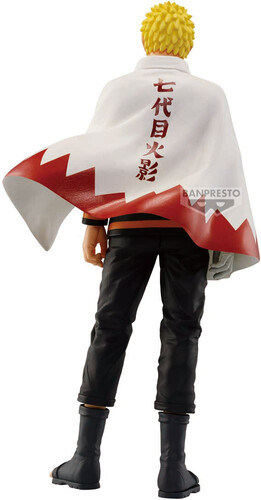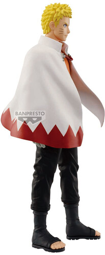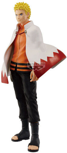 Standing approximately 9.4" tall, Naruto is depicted in his iconic white cloak with jagged red trim, layered over his classic orange and black attire. This collectible reflects Naruto’s calm, determined presence as the protector of his village.