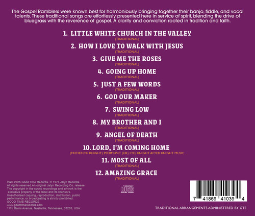 The Gospel Ramblers were known best for harmoniously bringing together their banjo, fiddle, and vocal talents. These traditional songs are effortlessly presented here in service of spirit, blending the drive of bluegrass with the reverence of gospel. A clarity and conviction rooted in tradition and faith.