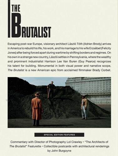 - Bonus features include Filmmaker Commentary with Director of Photography Lol Crawley, “The Architects of The Brutalist” Featurette (25 minutes) and six collectible postcards with architectural renderings by Ákos Sógor