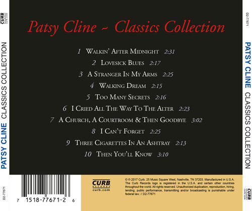 One of the greatest singers in the history of country music, Patsy Cline also helped blaze a trail for female singers to assert themselves as an integral part of the Nashville-dominated country music industry. Best Of Patsy Cline is a 12-track collection that features one big hit, "Walkin' After Midnight," and a selection of other hits, and B-sides. TRACKLISTING: 1. Walkin' After Midnight 2. Lovesick Blues 3. A Stranger In Arms 4. Walking Dream 5. Too Many Secrets 6. I Cried All The Way To The Altar 7. A Church, A Courtroom, & Then Goodbye 8. I Can't Forget 9. Three Cigarrettes In An Ashtray 10. Then You'll Know.