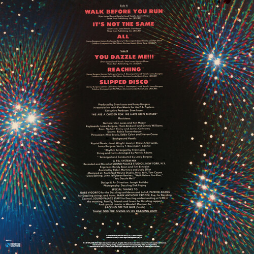 Released in 1979, Dazzle is a radiant gem of New York's disco underground, crafted with elegance and unmistakable groove. The album embodies the lush sophistication of late-'70s soul-funk, driven by intricate arrangements and a dazzling sense of rhythm. Conceived by the powerhouse trio of Patrick Adams, Leroy Burgess, and Stan Lucas, the project merges studio mastery with streetwise flair. Dazzle was a one-album studio collective, but it's impact resonates far beyond it's brief discography. Featuring a lineup of seasoned musicians and vocalists-including Jocelyn Brown and Krystal Davis-the ensemble delivers a sound that's rich, layered, and unapologetically glamorous. Dazzle stands out for it's orchestral textures, bold brass sections, and silky vocal harmonies that elevate the listening experience. The production is crisp, the energy magnetic, and the aesthetic pure disco opulence. Ideal for vinyl collectors and DJs seeking rare grooves, this LP remains a cult favorite among connoisseurs. Whether you're rediscovering the era or curating a standout selection, Dazzle offers timeless sophistication with undeniable dancefloor appeal.