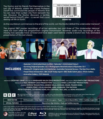 The Doctor and his friends find themselves in the lost city of Atlantis, where the crazed Professor Zaroff has convinced the people of Atlantis that he can raise their sunken city from beneath the sea. However, the Doctor discovers a terrible secret behind Zaroff's plan - a secret that could destroy all life on Earth. As the countdown commences to the end of the world, can the Doctor defeat the underwater menace? The original 1967 master recordings of all bar episodes two and three of 'The Underwater Menace' were lost soon after the programme's original transmission. However, audio-only recordings of the missing two episodes have survived and have been used here to create a brand new fully animated presentation of this lost classic.