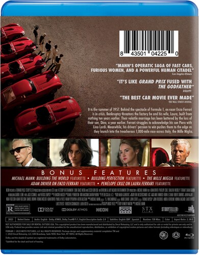 FERRARI is legendary director Michael Mann’s (HEAT, Miami Vice, Last of the Mohicans, Collateral) epic racing drama featuring Adam Driver. It is the summer of 1957 and ex-racer Enzo Ferrari (Driver) is in crisis, facing bankruptcy and a volatile marriage. Meanwhile, his drivers’ passion to win pushes them to the edge, as they launch into Italy's most treacherous race, the Mille Miglia. Also features Penélope Cruz , Shailene Woodley, and Patrick Dempsey.