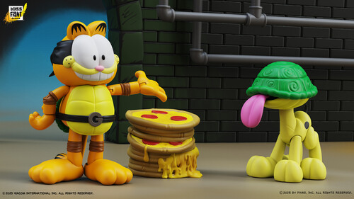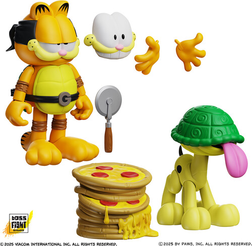 Based on a legendary comic strip with contributions from Garfield creator Jim Davis and TMNT Co-creator Peter Laird. In 1991 Garfield and Odie met the Teenage Mutant Ninja Turtles! Now, Boss Fight Studio is celebrating this epic crossover with a special action figure 2pk. Garfello has 25 points of articulation, a pizza cutter that can store in his belt, a huge stack of pizzas, interchangeable facial expressions and interchangeable hands. Sidekick Odie has 13 points of articulation, a turtle shell helmet and special wagging tongue.