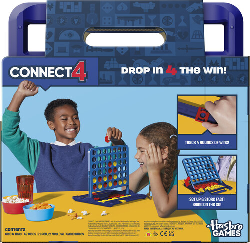 This edition of the popular 2 player game combines classic gameplay with fresh features, such as an all-in-1 carrying case, disc storage, and score tracking. To play, each player drops their discs into the grid and tries to get 4 of their colored discs in a row. Strategize and block opponents to sink the winning disc. The first to win 4 rounds is the champ, and now players can track wins with built-in score trackers.