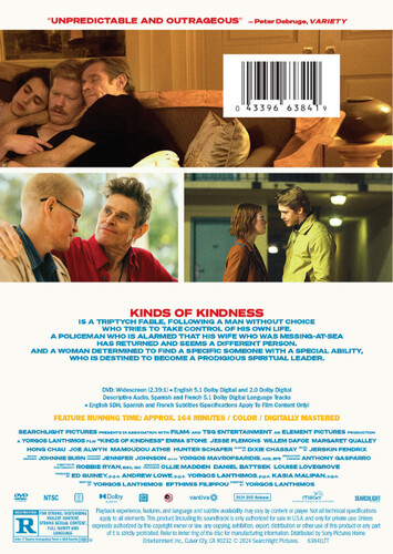 Kinds of Kindness is a triptych fable following a man without choice who tries to take control of his own life, a policeman who is alarmed that his wife who was missing-at-sea has returned and seems a different person, and a woman determined to find a specific someone with a special ability who is destined to become a prodigious spiritual leader.