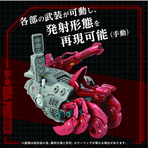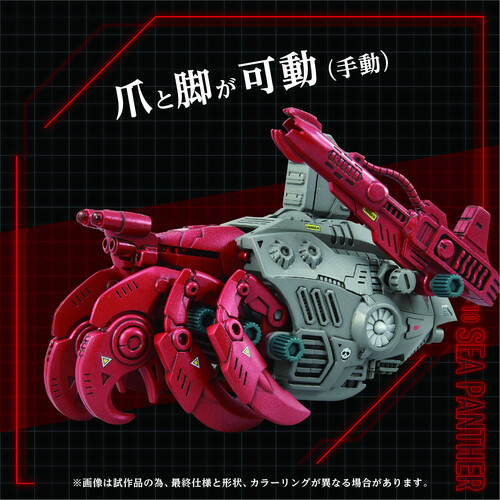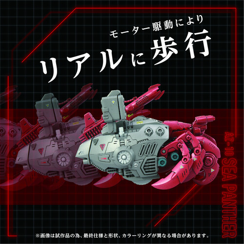 The Zoids AZ-10 Sea Panther Moving Plastic Model Kit features manually operated claws and legs, omni-directional ultrasonic sonar, a high-precision sensor antenna, motor-driven realistic walking action, a turret that moves up and down in conjunction with the walking action, a rotating fan, and arms that can be manually operated.