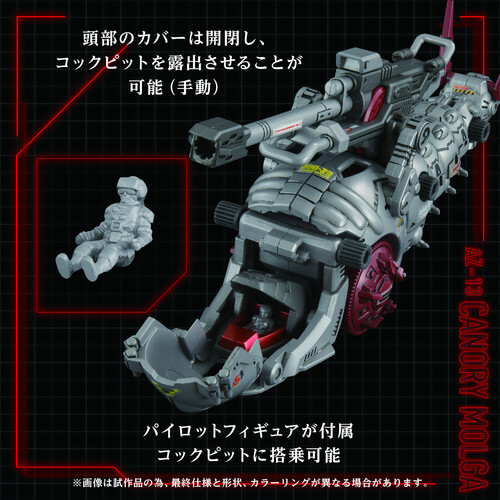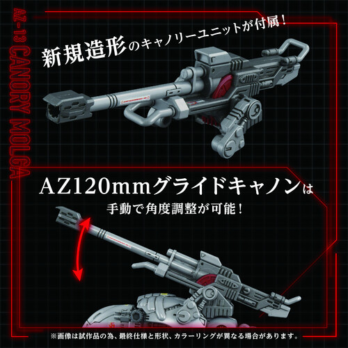 Activating the electric unit recreates the unique insect-like movement. Includes one 1/72 scale standard soldier figure that can be seated in the cockpit. Also features a newly sculpted cannon unit. The back of the Morga unit employs a gear linkage mechanism to transmit power. This gear linkage enables the Glide Cannon to perform its electric action.