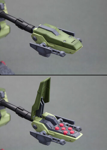 All 22 missile hatches equipped to the legs and torso can be opened and closed. The heavy artillery and the Hybrid Cannon includes a feature where it can slide in and out of the model to display the weapons in action. As an HMM-Zoid original configuration, the head sensor has a collapsible feature to avoid blocking the Hybrid Cannon when it is being moved. An anchor is added to the heels of the back feet to recreate LIGER ZERO PANZER as it is attacking.