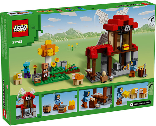 - Farm-equipment toys – Elements include a windmill millstone and a LEGO® Minecraft® loom as well as fun accessories, such as cake, bread, milk, shears and a barrel containing eggs and sugar