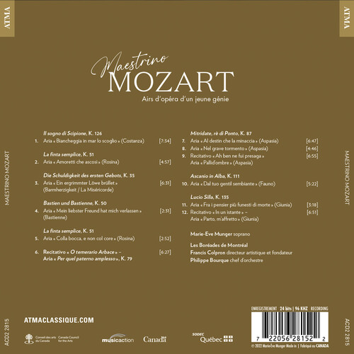 For her second collaboration on the ATMA Classique label, soprano Marie-Eve Munger releases Maestrino Mozart, an album devoted to Wolfgang Amadeus Mozart's rarely-heard arias composed between the ages of 10-16. Maestrino Mozart, out September 16, 2022, features Munger alongside Les Boréades de Montréal and conductor Philippe Bourque.