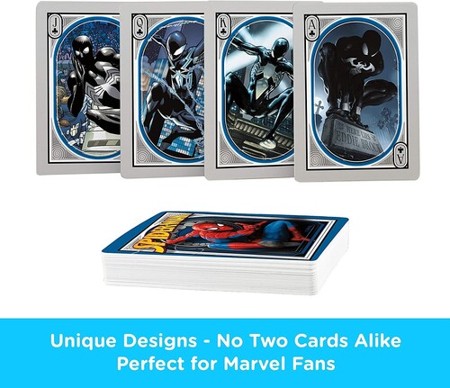 UNIQUE DESIGN ON EVERY CARD: This Marvel Comics deck of playing cards includes 54 cards (52 playing cards and 2 jokers). Every single playing card features its own distinct Spider-Man themed design and art. No two cards are alike