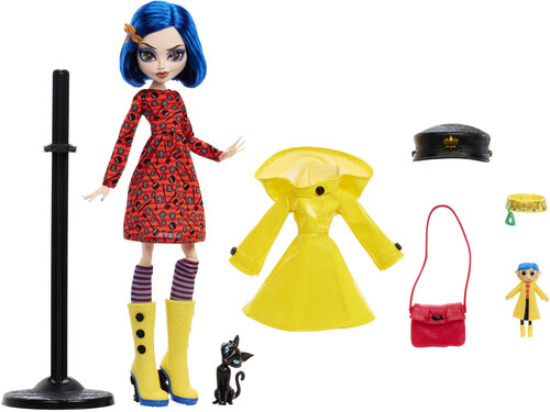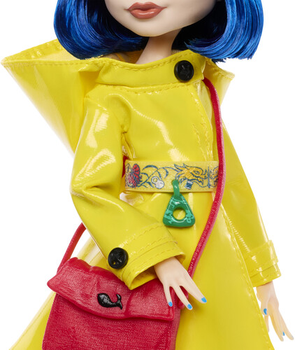 - This Skullector Coraline doll looks ready to explore the Pink Palace Apartments and its muddy grounds in her glossy yellow raincoat and matching spiderweb boots.
