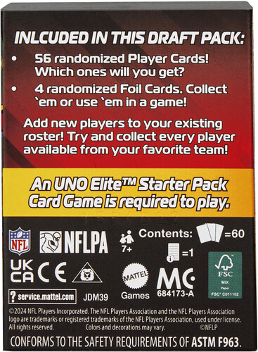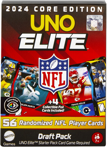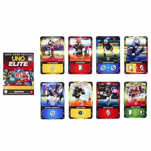 - Players can expand their Officially Licensed UNO Elite NFL roster with UNO Elite NFL Draft Packs (the UNO Elite Core Edition Starter Pack, sold separately, is required to play).