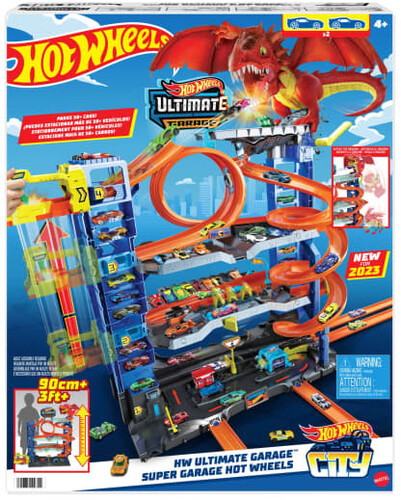 - Race, stunt and do battle with a dragon in the multi-level Hot Wheels™ City Ultimate Garage.