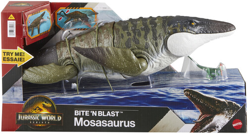- Jurassic World lives! Bring the excitement and thrills of Jurassic World Rebirth home with this distinctive Mosasaurus with exciting Bite ‘N Blast moves, articulated fins and tail and 25.7-inch long size!