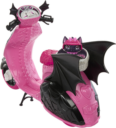 The clock has struck midnight at Monster High, and Draculaura is ready for an adventure on her Vamptastic Scooter! Her pet bat Count Fabulous is coming along for the ride and they even have matching helmets!
