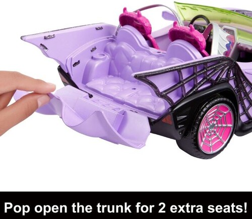 - It fits four Monster High™ dolls: two in the front, and two in the back where the trunk pops open to offer two additional seats. Dolls not included.