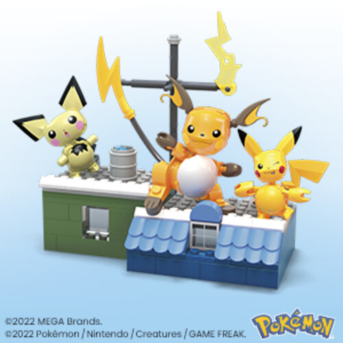 Prepare for battle with an electric trio. This building set features Pichu, Pikachu, and Raichu, each with articulated limbs, and a rooftop environment. Build all 3 figures along with a special environment featuring battle effect details which the figures can be posed within for an electrifyingly authentic building experience.