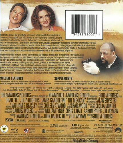 Brad Pitt is Jerry, a low-level Mafia "mechanic" whose ineptitude is countered by frequent bursts of dumb luck. Julia Roberts is Jerry's girlfriend, and she wants him to get out of the business. Before Jerry can depart ways with the mob, he must do one last errand - go to Mexico and recover a rare, valuable, and possibly cursed pistol known as "The Mexican." He finds the weapon with ease but making his way back to the States proves to be more challenging, especially when hired hitman Leroy (James Gandolfini) plans to kidnap Samantha until Jerry comes back. Director Gore Verbinski (PIRATES OF THE CARIBBEAN) brings to the screen a unique mix of action-comedy and road-movie chaos in this unpredictable, original hit.