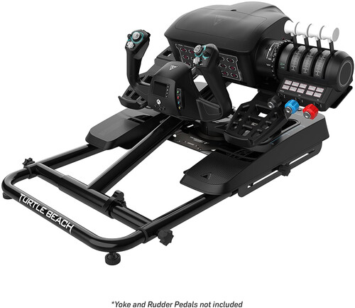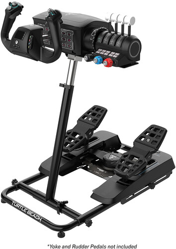 Complete your flight or racing simulation setup with the Turtle Beach VelocityOne Stand for the VelocityOne Flight Yoke System, VelocityOne Rudder Universal Rudder Pedals, and other flight simulation and racing simulation accessories. Built-in quick release latch lets you loosen the main shaft to adjust the height, angle, and length of the Stand to adapt to your size and environment. Plus, you can tilt both the upper mounting platform for a yoke or wheel, and lower platform to set the perfect angle for a set of racing pedals or rudder pedals. Solid steel mounting platforms are predrilled to work with VelocityOne Flight & VelocityOne Rudder products and are also fully compatible with other 3rd party simulation accessories. Anti-wobble, adjustable rubber feet keep the Stand firmly planted, and a convenient fold flat design lets you easily stow away your setup without needing to unmount your accessories when not in use.