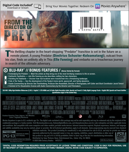 Dismissed as a runt by his clan, young Predator Dek (Dimitrius Schuster-Koloamatangi) was determined to prove himself by traveling to the perilous planet Genna and making a trophy of it's dominant species, the Kalisk. After a crash-land, Dek encountered the damaged android Thia (Elle Fanning), bisected as a result of her own disastrous Kalisk hunt... and found an unlikely but necessary partner in survival against a deadly prey, in this thrilling seventh franchise entry. 107 min. Widescreen; Soundtrack: English.