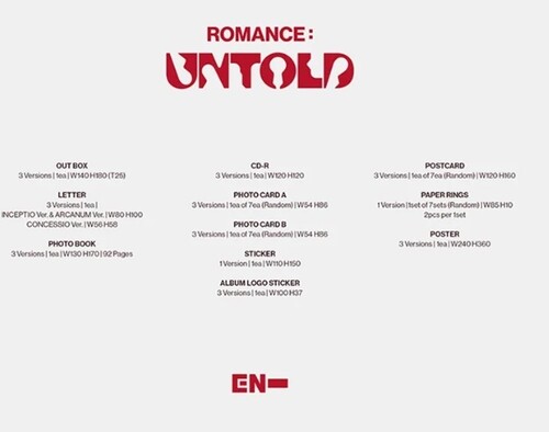 ENHYPEN / ROMANCE : UNTOLD [ARCANUM VER.] Exterior: 1 each version - Version : INCEPTIO Ver. / ARCANUM Ver./ CONCESSIO Ver. - CD-R: 1 - Photo Card A: Random 1 out of 7 versions - Photo Card B: Random 1 out of 7 versions - Sticker: 1 type - Album logo sticker: 1 each version - Postcard: Random 1 out of 7 version - Papering : Random 1 set of 7 sets (2 pieces per set) - Poster: 1 each version.