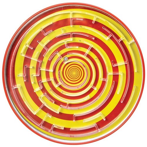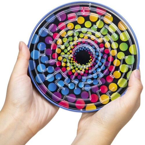 A colorful tin base lies under metal ball bearings that creates a sturdy feel for at-home or portable play. Each base has a captivating printed design, playing tricks on your eyes and taking this tin maze to a whole new level!