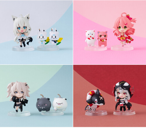 A collection of approximately 2" tall mini, chibi style soft vinyl figure collection featuring a mix of the virtual talent, fan mascot avatars, and pets.