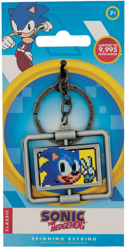 At the end of each stage in the very first Sonic game, released 35 years ago this year, you pass a sign of Dr. Eggman which flips round to reveal a picture of Sonic as he runs past it. This sign is created here in keyring form, with the central element rotating to show either Sonic or Eggman. Each one is numbered on the reverse and is limited to 9,995 worldwide.