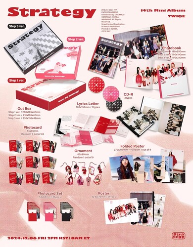 TWICE -"STRATEGY" [Step 3 ver.] Continuing to break records globally, TWICE is back with their newest and latest 14th Mini Album titled 'STRATEGY' - available in 3 versions: Step 1 ver., Step 2 ver., and Step 3 ver. Contents of the album include: CD, Photo Book (88 pages), Photo Card (random 5 of 45), Folded Poster (random 1 of 9), Ornament (random 1 of 9), Lyrics Letter and Photo Card Set. US/EU Exclusive: Poster. Dimensions: 185 x 268 x 42 mm (Step 1 ver.) / 196 x 210 x 42 mm (Step 2 ver.) / 156 x 230 x 42 mm (Step 3 ver.). [Step 3 version] Virgin Music; JYP Entertainment/IMPERIAL/Republic; K-Pop. Artist Hometown: Seoul, South Korea.