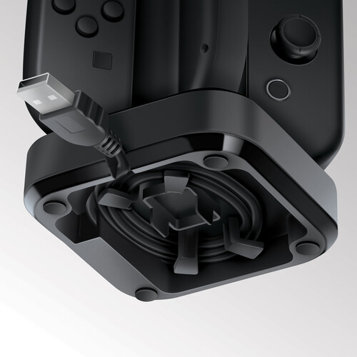 Unique cross formation charger that allows up to 4 Joy-Con controllers to charge simultaneously. Designed specifically to match the aesthetics of the Nintendo Switch console while also featuring a built-in cable management/length adjustment system to keep cords organized.