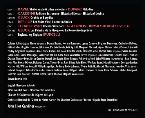 My love for baroque music has never been exclusive. Of course I am attracted by period instruments, but that has never been an end in itself. For me, it is simply a matter of always moving further towards the truth, towards a fresh interpretation." As idiomatic and revelatory in Bach, Handel, Purcell, Rameau and Campra as in Gluck, Berlioz, Offenbach, Chabrier and Massenet, Sir John Eliot Gardiner is a conductor whose passion and curiosity for music seem as inexhaustible as his enterprising spirit. This 64CD set unites his entire discography for Erato, EMI and Virgin, produced over a period of nearly 20 years. Many of the recordings cast new light on the repertoire, expanding Gardiner's influence and enhancing his reputation as the guiding force of the Monteverdi Choir and Orchestra, English Baroque Soloists, and Orchestre de l'Opéra de Lyon. As the Financial Times has written :.What Gardiner demonstrated... is that stylistic fidelity is a movable feast, and he has not lost his hunger for it."