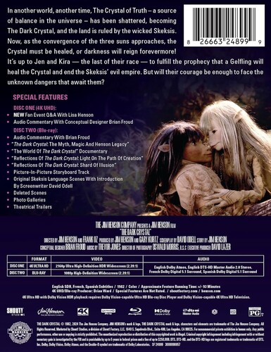 A thousand years ago on the planet Thra, two new races of beings emerge after the Dark Crystal is broken: the nefarious Skeksis and the peaceful Mystics. Years later two elf-like beings must find and repair the powerful crystal to save their world from falling under the eternal rule of Skeksis. Exciting fantasy/adventure from Muppet masters Jim Henson and Frank Oz and "Star Wars" producer Gary Kurtz with an all-puppet cast features the voices of Henson, Kathryn Mullen, Oz, Billie Whitelaw. 93 min. Widescreen; Soundtracks: English Dolby Atmos, DTS HD stereo Master Audio, French Dolby Digital 5.1, Spanish Dolby Digital 5.1; Subtitles: English (SDH), French, Spanish; interview. Two-disc set.