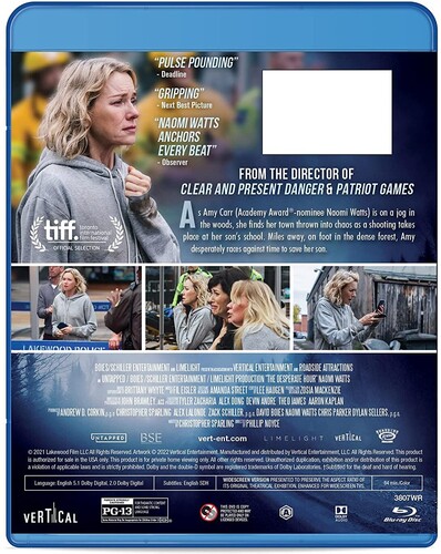 Unfolding in real time, The Desperate Hour is a “riveting and pulse pounding” thriller from awardwinning director Phillip Noyce. Recently widowed mother Amy Carr (Academy Award®-nominee Naomi Watts) is doing her best to restore normalcy to the lives of her young daughter and teenage son in their small town. As she's on a jog in the woods, she finds her town thrown into chaos as a shooting takes place at her son's school. Miles away, on foot in the dense forest, Amy desperately races against time to save he