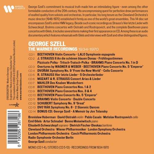 Limited 14 CD set. George Szell's commitment to musical truth made him an intimidating figure - even among the other formidable conductors of the 20thcentury. His uncompromising quest for perfection drew performances of exalted quality from soloists and orchestras. In particular, his long tenure as the Cleveland Orchestra's music director (1946-1970) established it firmly as one of the world's great ensembles. This set encompasses Szell's entire HMV legacy. Beside such iconic recordings as Strauss's Vier letzte Lieder with Schwarzkopf, Brahms concertos with Oistrakh and Rostropovich, and the complete Beethoven piano concertos with Gilels, it includes several items making their first appearance on CD. Among these is an audio documentary which features rehearsals with Gilels and interviews with Szell and other distinguished figures.