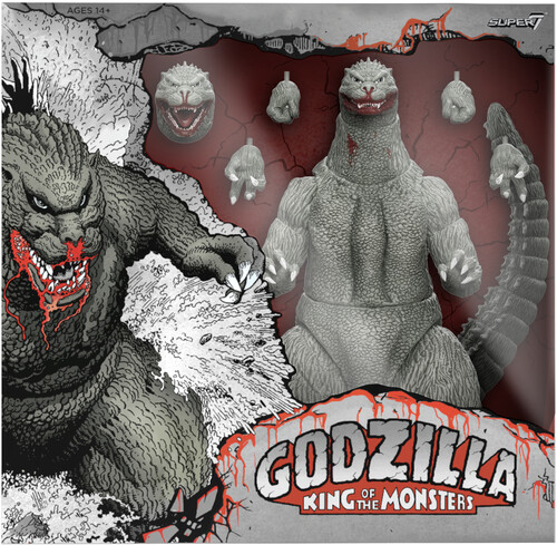 This figure has 19 points of articulation and comes with 2 interchangeable heads and multiple interchangeable claws. Intricate sculpting and paint details bring this formidable creature to life. The Toho ULTIMATES! Godzilla ’89 (Thirsty for Blood) figure comes in window-box packaging designed to make it look like he’s just crashed through the box, leaving splatters of blood red against a greyscale backdrop.
