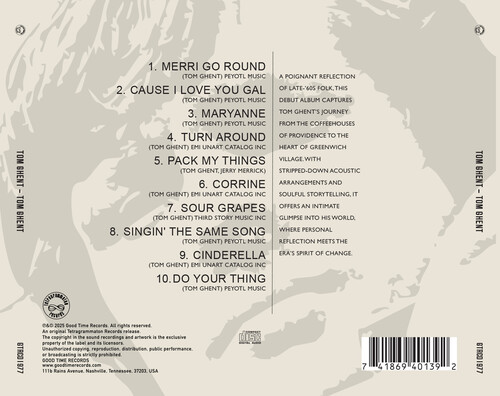 A poignant reflection of late-'60s folk, this debut album captures Tom Ghent's journey from the coffeehouses of Providence to the heart of Greenwich Village. With stripped-down acoustic arrangements and soulful storytelling, it offers an intimate glimpse into his world, where personal reflection meets the era's spirit of change.