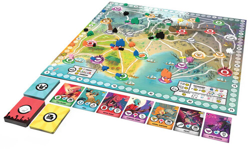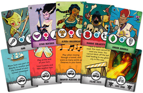 Components: 52 Seasoned Artist Cards, 24 Starting Artist Cards, 82 Action Cards, 25 City Cards, 6 Band Meeples, 6 Hometown Tokens, 96 Tour Tokens, 21 Dragon Tokens, 2 Barrier Tokens, Super-Fan Meeple, Groundhog Meeple, Rule Book