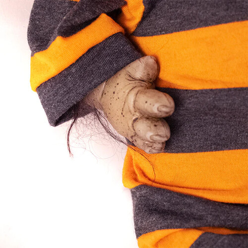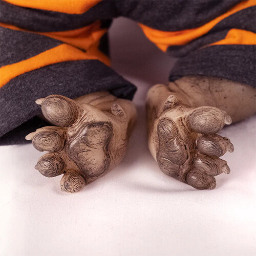Cooper is the size and weight of a new born with added spooky charm! He features a solid silicone head, arms and legs attached to a weighted plush furry body, giving the look and feel of holding a real live baby werewolf!
