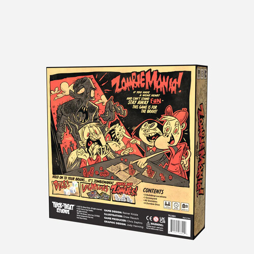 Zombie Mania is a push your luck dice game where players try to remove the zombies who have invaded their buildings with successful dice rolls. You may re-roll your dice if you saved a gravestone that toss, but will you improve your results, or fail to remove any zombies at all by continuing to roll? First player to remove all Zombies from their building wins!