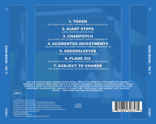 On the cusp of jazz fusion's evolution, 'Trio '77' stands as a testament to George Muribus's unique vision and voice in a rapidly changing musical landscape. Each track carries a spirit of exploration, as the trio navigates through intricate rhythms and harmonic complexities, making it clear that these musicians weren't just playing notes - they were shaping an experience