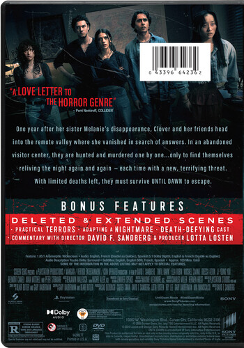 One year after her sister Melanie mysteriously disappeared, Clover and her friends head into the remote valley where she vanished in search of answers. Exploring an abandoned visitor center, they find themselves stalked by a masked killer and horrifically murdered one by one... only to wake up and find themselves back at the beginning of the same evening. Trapped in the valley, they're forced to relive the night again and again - only each time the killer threat is different, each more terrifying than the last. Hope dwindling, the group soon realizes they have a limited number of deaths left, and the only way to escape is to survive Until Dawn.