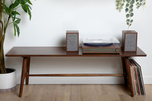Featuring a full-size, belt-driven turntable and matching stereo bookshelf speakers, the Harmony system delivers warm, detailed vinyl playback with deep bass and crisp highs.