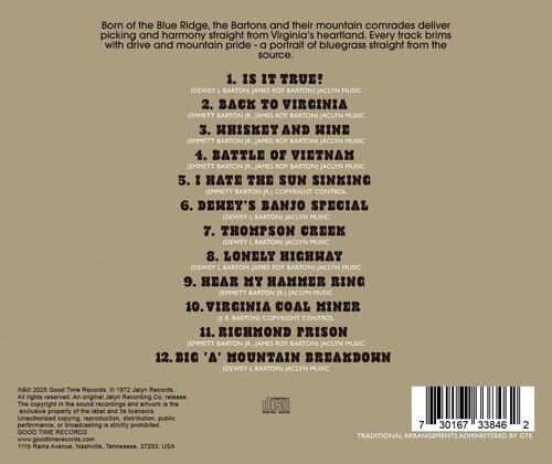 Jalyn Records is back! The Dayton, Ohio label from the creative mind of bluegrass legend Jack Lynch originally ran from the early '60s through the late '70s. Working out of his apartment on Brown Street, Lynch turned out a steady run of hard-driving bluegrass, country, and gospel sides cut by local pickers and big names alike, including Ralph Stanley and Don Reno. Decades on, these records are now lovingly remastered for modern ears and available on CD for the first time. Born of the Blue Ridge, here the Bartons and their mountain comrades deliver picking and harmony straight from Virginia's heartland. Every track brims with drive and mountain pride - a portrait of bluegrass straight from the source.