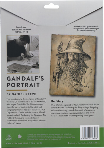 Portrait of Gandalf the Grey is reproduced on 140 gram art stock. The edges are diecut, adding to the authenticity and making for a beautiful and considered pairing, alongside your Portrait of Bilbo Baggins. The art print comes flat with a sturdy piece of cardboard, individually packaged for further protection. It has logos and legal text on the reverse - none on the front.