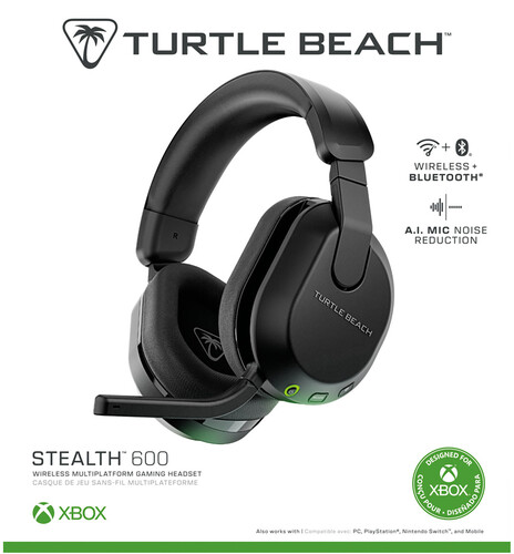 The Turtle Beach Stealth 600 wireless multiplatform gaming headset for Xbox, PlayStation, PC, Nintendo Switch, Steam Deck and mobile is refreshed for a third generation of gaming domination. The built-in QuickSwitch button lets you switch easily between low-latency wireless and Bluetooth connections so you never miss a moment of action. Deliver clear commands with the Gen 3, flip-to-mute mic with A.I. noise reduction and hear precise, detailed gaming audio with 50mm Nanoclear drivers. Plus, using the Swarm